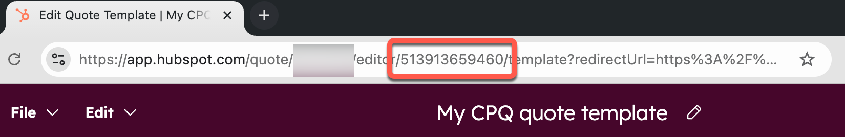 Templates for CPQ quotes can be created and customized in the HubSpot UI. When creating a CPQ quote via the API, you can specify a quote template to use by associating it with the quote at the time of creation. The quote template’s properties, content, and associations will be added to the quote as supplemental information, with properties set on the quote overriding the quote template’s settings. There are multiple ways to retrieve the ID of a CPQ quote template:- Retrieve via the quote template editor in HubSpot